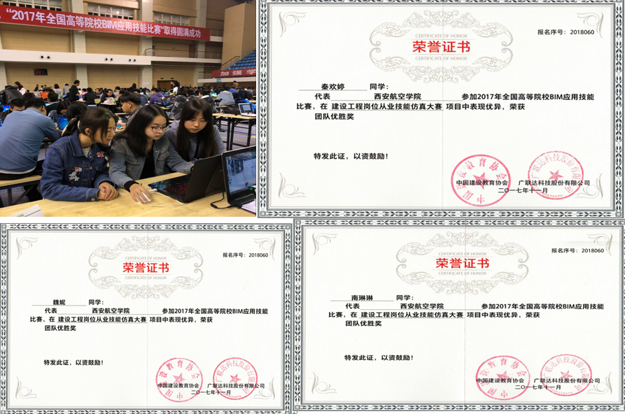 由中国建设教育协会主办,江苏建筑职业技术公司承办,广联达科技股份有限公司协办的2017年“全国高等院校BIM应用技能比赛”总决赛于2017年10月29日举行,由汪丽、党伟、李华志老师指导的团队参加了第一届建设工程岗位从业技能仿真大赛,共有80多所高校参赛,经过四个小时的紧张角逐,最终获得了本科组的团队优胜奖。