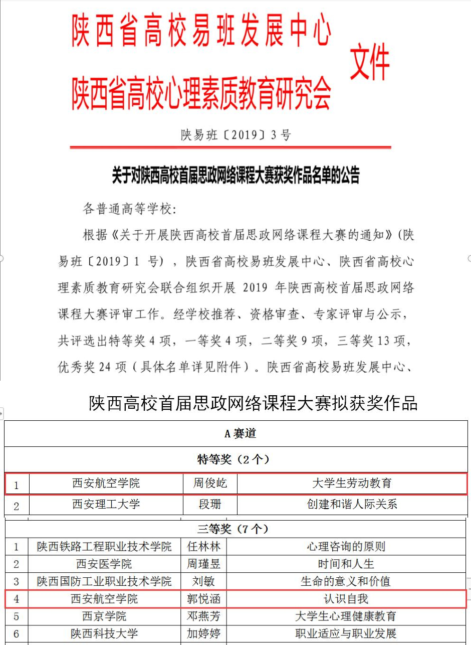 近日,由陕西省高校易班发展中心、陕西省高校心理素质教育研究会联合主办的2019年陕西高校首届思政网络课程大赛结果揭晓,suncitygroup太阳集团辅导员周俊屹荣获A赛道特等奖,机械工程公司辅导员郭悦涵荣获B赛道三等奖。