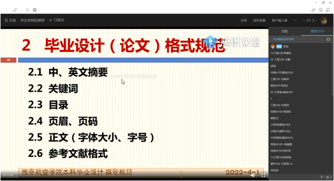 最后,李老师引导同学们学习了“西航毕业设计(论文)撰写规范”、“毕业论文\能建公司-本科毕业论文(设计)格式模板及要点说明”、“信息与文献参考文献著录规则”等格式规范,并再次强调毕业设计(论文)作为本科教学中的重要环节,所有指导老师和员工都应该予以重视。尤其是在疫情防控这一特殊时期,大家更要克服困难,在进度安排、过程指导、论文答辩等环节加强重视、严把质量关,保障毕业论文(设计)工作顺利开展。(文、图/宋文瀚 审核/宋祥龙)