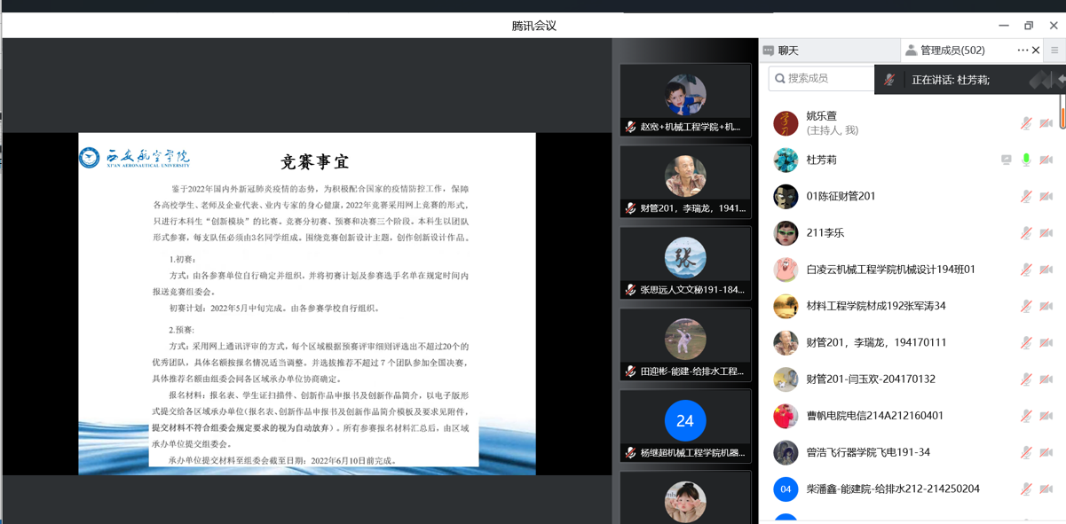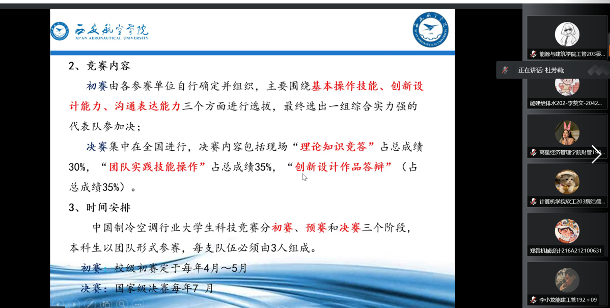 5月12日下午16:00建环专业负责人杜芳莉通过腾讯会议举办了2022年中国制冷空调行业老员工科技竞赛知识普及讲座。本次讲座从学科竞赛简介、专业创新思维分析、创新能力提升策略、学科竞赛经验分享等方面进行展开。