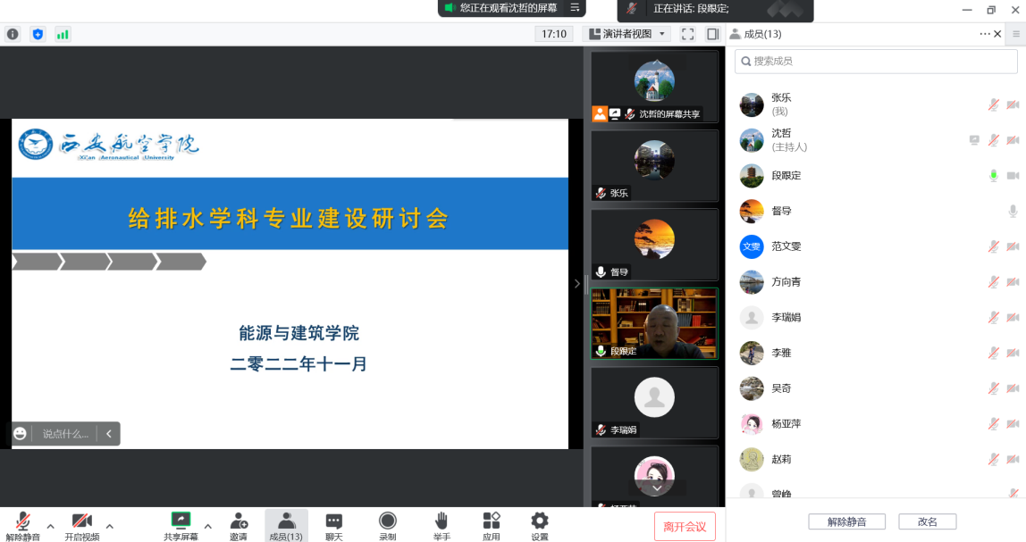 2022年11月11日晚7点,给排水教研室通过线上会议召开了学科专业建设工作研讨会,公司督导雒新峰、公司经理杨亚萍、给排水教研室全体老师参加了会议,会议由教研室主任沈哲主持。