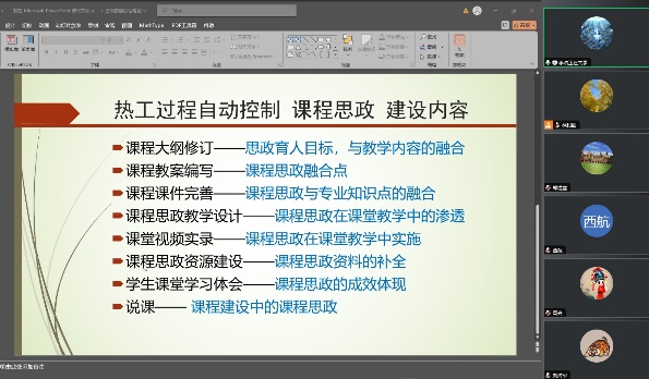 按照活动安排,首先由郑煜鑫老师、周亮老师、徐甜甜老师分别介绍“汽轮机原理”、“传热学B”、“热力发电厂”的知识图谱建设经验,然后由李洁老师介绍“热工过程自动控制”的课程思政建设要点。