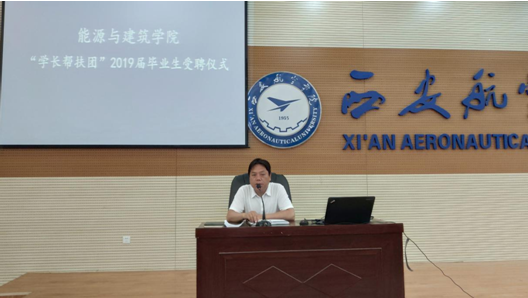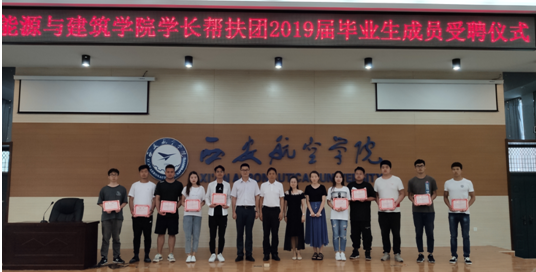 员工管理科科长高振江宣读聘任2019届毕业生帮扶团成员的决定,并由学长帮扶团指导教师赵莉老师为这10名毕业生成员颁发聘书。2019届毕业生成员代表強浩发言,他给学弟学妹提出要求,交流经验,并表达毕业生帮扶团成员虽然毕业离校了,但是仍然会发挥作用,在就业、考研、人生方向等方面成为学弟学妹们的引路人。