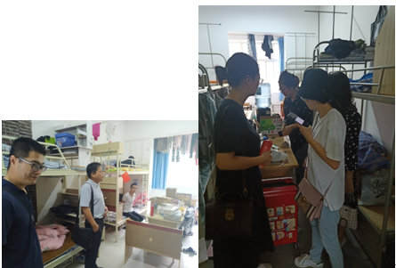 8月31号上午,公司党总支书记刘剑坤,员工管理科科长高振江,辅导员周俊屹老师,樊梦云老师,阎静老师,裴蕾老师前往三号及五号公寓对宿舍卫生及宿舍安全进行检查。