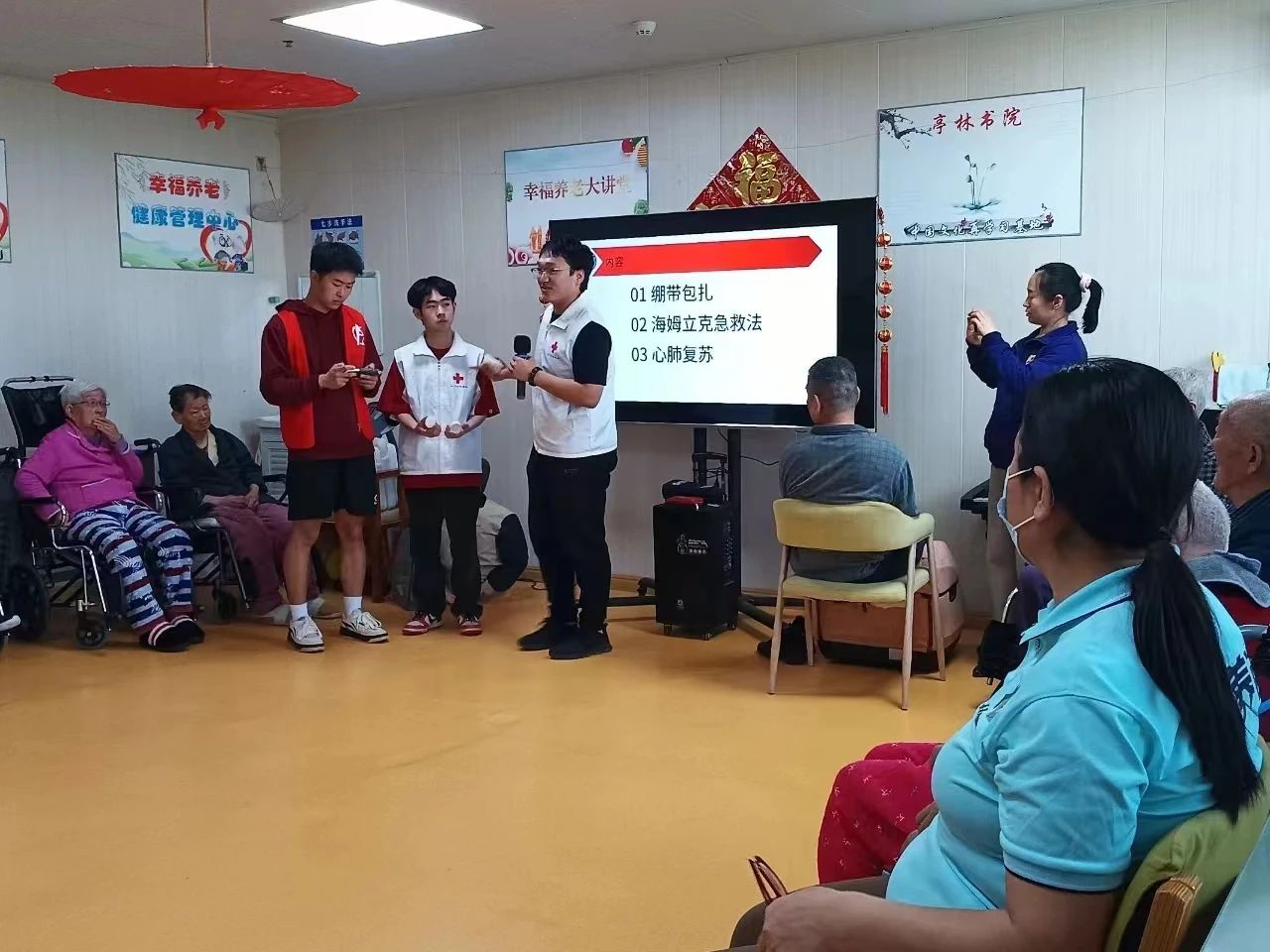 在养老院中,大多数老人年事已高,为防止不必要的危险,红十字协会分别为老人和护工们教授海姆立克急救法和急救心肺复苏等技能,以及分享养生等知识。