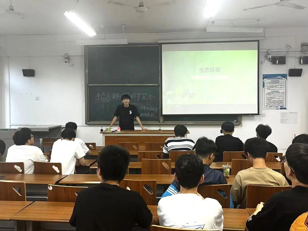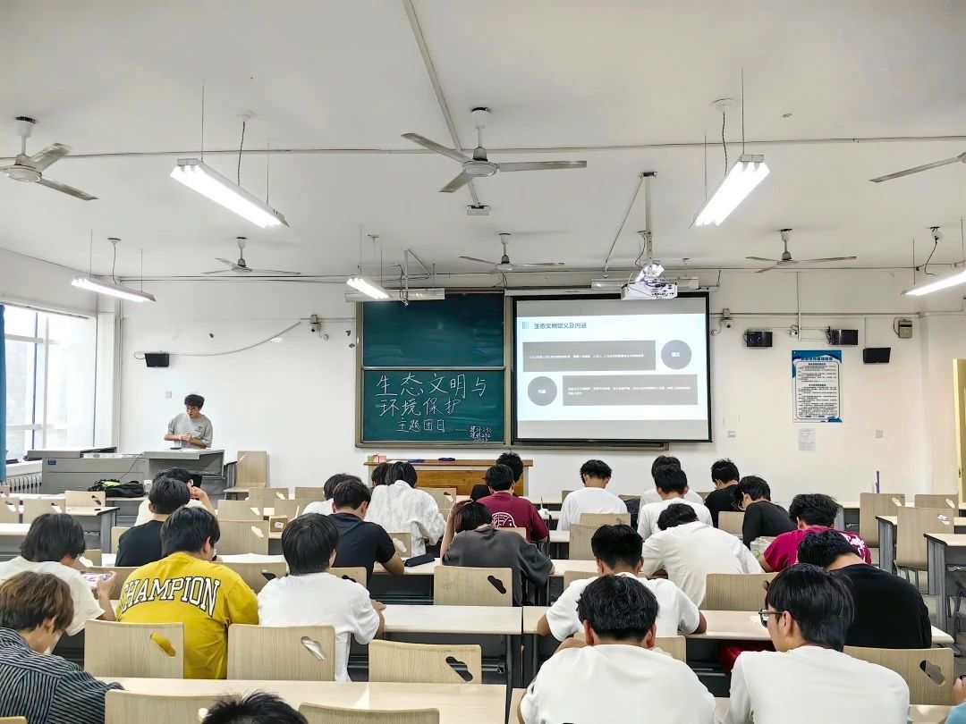 各支部团支书就生态文明的内涵、重要性、面临的挑战、以及个人和社会的责任,通过ppt向同学们逐一讲解,团支书们通过习近平生态文明思想引导同学们深刻认识和理解“尊重自然、顺应自然、保护自然”,同学们了解到生态文明保护的重要性,播放了与生态文明相关的纪录片,直观地展现了生态环境问题和保护成果,引起同学们的共鸣。同时,同学们就绿色发展话题展开热烈讨论,分享自己的见解和体会。大家一致认为,绿色发展不仅是国家的战略要求,更是每个人的责任和使命。只有每个人都积极行动起来,才能共同建设一个美丽、和谐、可持续的家园。