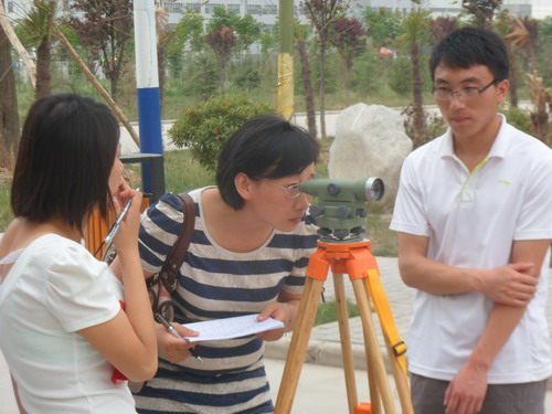 6月8日下午4点,实操比赛拉开了帷幕。有39名选手参加,分成13个小组,每组3人协作参赛。雒新峰、汪丽、李华志老师担任比赛评委。在雒主任宣布了比赛规则后,选手们立即开始行动,紧张而有序地进行安置仪器、对中调平、确定目标、调焦、对准、读数等各个环节。