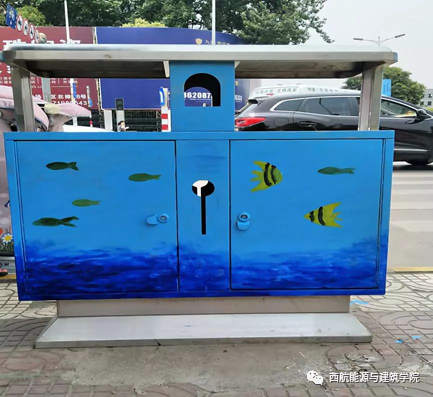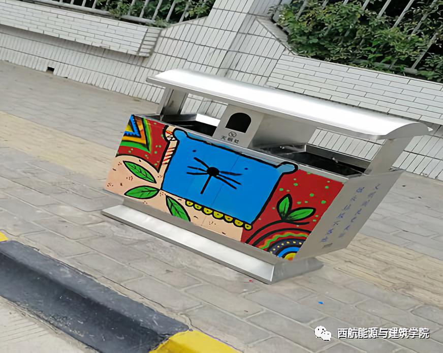 公司志愿者拿着画笔仔细认真的绘画出一幅幅美丽的图案,使阎良的部分街道井盖和垃圾桶变得更加美观。