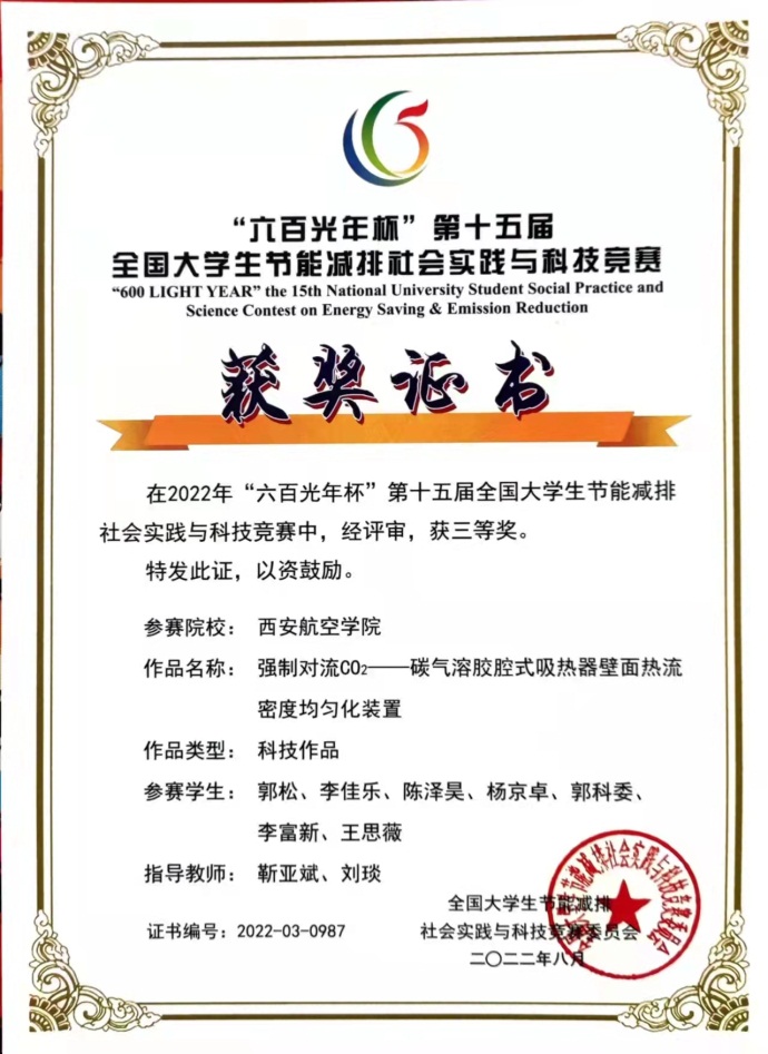 受疫情影响,响应减少聚集性活动倡议,5月18日在线上举行了校赛路演,经过赛前筛选,总计有六支队伍参加校赛路演,决出校赛一二三等奖。国赛采取线上报名方式进行,公司共计有三支队伍线上参赛,每支队伍配有专业指导教师,对参赛作品进行了精心打磨,制作了精美模型及展示视频。经过专家会审评比,教师靳亚斌指导项目—“强制对流CO₂-碳气溶胶腔式吸热器壁面热流密度均匀化装置”获得国家级三等奖。