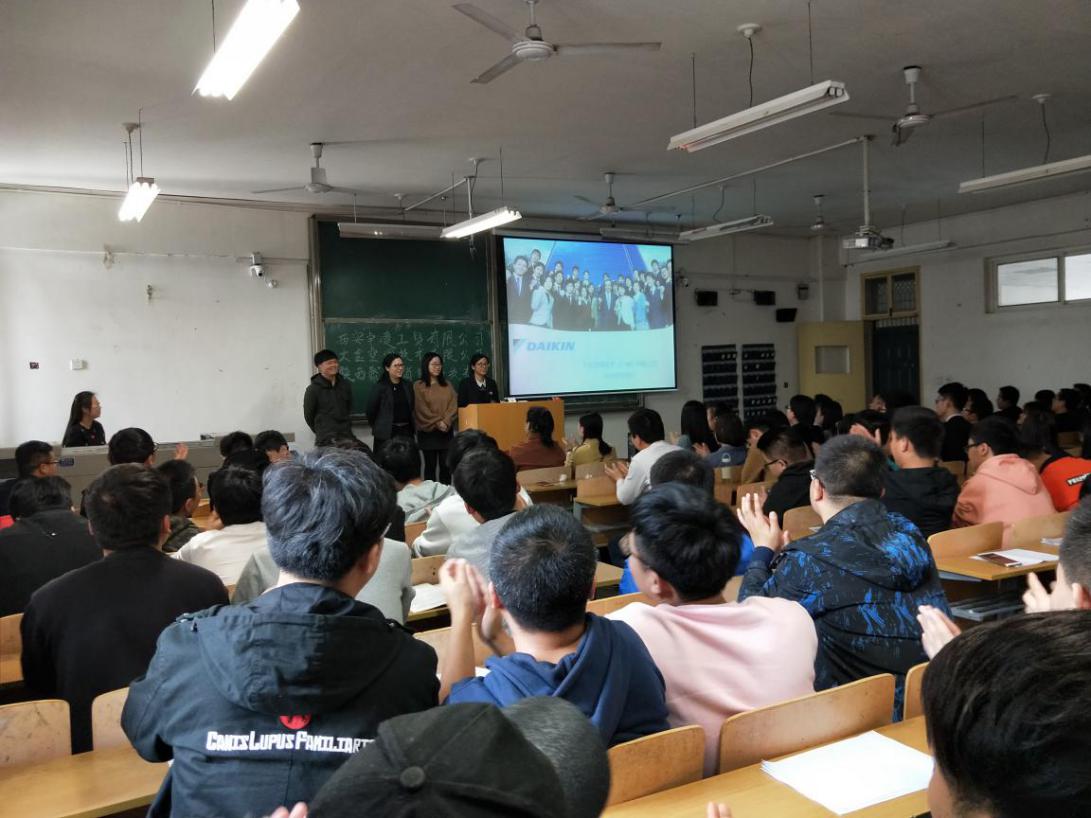 各家单位的人事经理依次进行PPT宣讲,介绍了所在公司的企业文化,招聘专业需求、岗位技能要求等,其中大金空调技术有限公司和陕西聚慧消防科技有限公司还派出公司往届毕业生作为优秀员工代表前来给学弟学妹们分享工作经历和就业经验。学长学姐在公司的成长经历激发同学们对工作的向往,增强了自信。