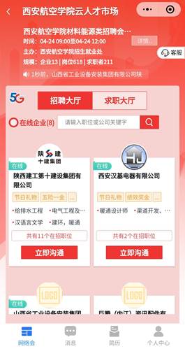 4月24日上午9-12时,公司成功举办2020届春季“材料能源类”网络招聘会,参加本次网络招聘会的有陕西建工第十建设集团有限公司、西安汉基电器有限公司等13家企业,提供618个工作岗位,现场共211余名毕业生参会。